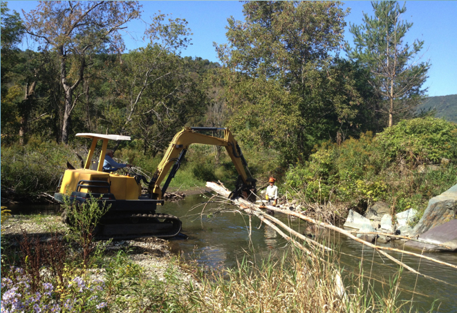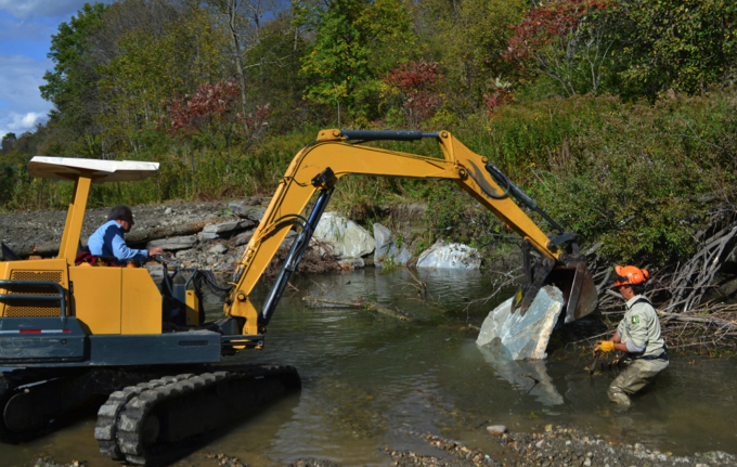 Our SWVT Chapter has been working with the US Forest Service and Poultney Mettawee Natural Resources Conservation District on restoring fish habitat in the Mettawee River. Working on one section at a time, the group has successfully un-channelized and stabilized sections of the river, as well as created new fish habitat through the placement of tree, root wad, and stone structures.